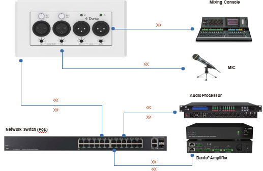 100M Dante®digital audio input/output port, connected to the Network Switch through RJ45 line, supporting PD power supply.